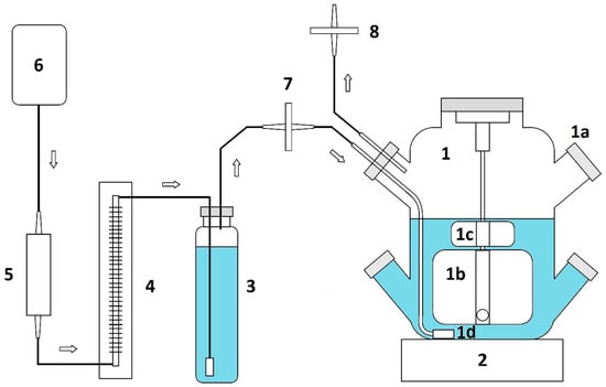 A stirred tank bioreactor of the spinner flask type equipped with a magnetically driven plate stirrer was used. Preliminary experiments were conducted using the bioreactor system described earlier [30], albeit without controlling the dissolved oxygen levels. Eventually, the system was modified by placing an additional stirrer above the main stirrer plate. The bioreactor configuration used in this research is depicted in Figure 6. The working volume was set at 3 L, and the inoculum was 20 g/L of medium. The S. henryi cultures were propagated using Murashige and Skoog (MS) medium with the addition of 3% (w/v) sucrose and 2 mg/L indolyl-3-butyric acid (IBA) and 1 mg/L 6-benzyladenine (BA). Each time, the callus biomass grown on stationary MS medium for about 20 days was used to initiate the experiment. The callus required for cultivation was collected using a metal spoon and weighed in a glass beaker until the mass was 60 g (finally corresponding to 20 g/L of medium). Then, the inoculum was suspended in the medium (approx. 50 mL), and the callus agglomerates were crushed using a glass piston. The above activities were performed under aseptic conditions. The materials prepared in this way were placed in a culture vessel with a growth medium (3 L). The tightly closed bioreactor was placed on a magnetic stirrer (Variomag Biosystem Direct magnetic stirrer, Thermo Fisher Scientific, Waltham, MA, USA, mixing speed 40 rpm) and connected to an aeration system (Optima air pump, Hagen, Montreal, Canada, 0.5 L/min, 0.17 vvm). The biomass was collected at 5-day intervals, starting from day 5 to day 30, each time the installation was emptied (batch culture). The experiments in the bioreactor were conducted with four repetitions (n = 4).