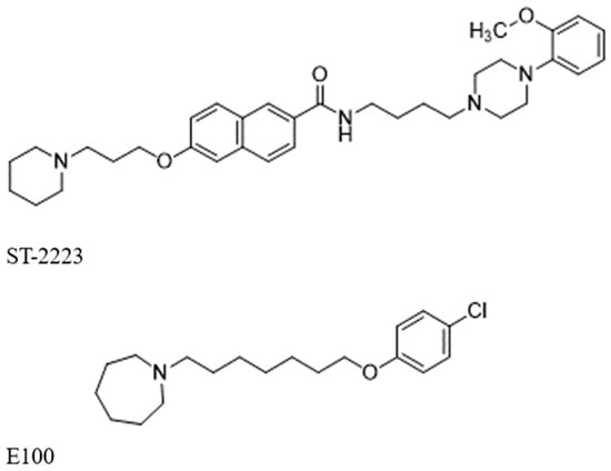 Structures of ST-2223, acting as histamine H3, D2/D3 receptor antagonists, and E100, H3R antagonist with acetylcholinesterase inhibitory activity.