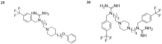 In summary, we report the identification of novel multitarget-directed ligands from the group of (ω-piperazin-1-ylalkyl)guanidine derivatives through virtual screening. Compounds 25 and 30 (Figure 5), which have demonstrated significant activity towards H3R (pA2 = 7.90 and 7.99, respectively [53]) in previous studies, also exhibited notable binding ability to the D2R, displacing over 50% of the radioligand at a screening concentration of 1 µM. Additional tests revealed more selective binding of compound 30 to D2R (pKi = 6.12) over D3R (pKi = 4.84) receptors than that of compound 25. These compounds might serve as a promising starting point for the rational development of new multifunctional ligands, offering potential for the introduction of a new and effective therapy for ASD.