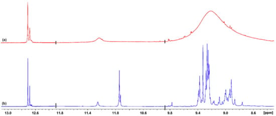 (a) 500 MHz 1H NMR spectrum of the phenol-OH region of 20.14 mg carob leaf acetone extract in 500 μL DMSO-d6. (b) The same spectrum as in (a) after titration with trifluoroacetic acid solution in DMSO-d6. NMR spectra were acquired at 295 K and with 64 scans, 1.9 s acquisition time, and a relaxation delay of 4.0 s.