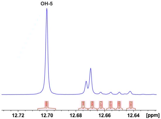 The 1D 1H NMR spectrum of the CLAE in acidified DMSO-d6 with trifluoroacetic acid indicates a significantly enhanced resolution of the phenοl -OH groups compared to those in ordinary DMSO-d6 (Figure 1). The use of the 800 MHz instrument resulted in several very sharp resonances (Δν1/2 < 2.0 Hz) with excellent resolution in the strongly deshielded region above 11 ppm (Figure 2), which can be attributed to OH(5) protons of flavonoids, which participate in a strong intramolecular hydrogen bond with the oxygen atom of the carbonyl CO(4) group [20]. Three major flavonoids were detected, with chemical shifts of 12.700, 12.673, and 12.670 ppm and relative integrals of 1.00:0.14:0.30, respectively. The resonances at 12.663, 12.656, 12.650, and 12.642 ppm have relative integrals <0.04 compared to that of the major analyte at 2.700 ppm (Figure 2). The sharp -OH resonances allowed the application of the 1H–13C heteronuclear multiple bond correlation (HMBC) experiment. The OH(5) proton of the major analyte at 12.70 ppm shows six cross peaks at C5 (163.21 ppm), C6 (100.54 ppm), C7 (166.06 ppm), C9 (158.34 ppm), C10 (105.89 ppm), and C4 (179.61 ppm) (Figure 3). The OH(7) at 10.94 ppm shows a smaller number of cross peaks at C5 (163.21 ppm), C6 (100.54 ppm), C7 (166.06 ppm), C8 (95.38 ppm), and C9 (158.34 ppm) due to having a larger line width (Δν1/2 ~ 3.7 Hz). The common 13C cross peaks of the OH(5) and OH(7) protons demonstrate that they belong to the same ring system (Figure 3). The cross peak of the OH(5) at CO(4) is, also, of high diagnostic value due to the great sensitivity of δ(13C) to conjugation. Thus, the strong shielding at 179.61 ppm indicates the presence of a C2–C3 double bond; the absence of the double bond resulted in δ(13C) in the range of 196–199 ppm [20].