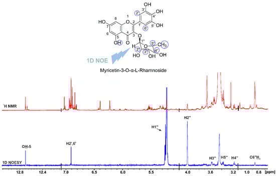 The second major flavonoid at 12.670 ppm has an integral of ~30% compared to that of myricetin-3-O-α-l-rhamnopyranoside (δ = 12.700 ppm, Figure 2). The 1H-13C HMBC spectrum (Figure S1) shows identical cross peaks of the OH(5) with C7 and C5. In addition, the CO(4) connectivity (δ = 179.34 ppm) shows the presence of a C2–C3 double bond, and the shielding by 0.27 ppm relative to that of myricetin-3-O-α-l-rhamnopyranoside also indicates the presence of a myricetin derivative with a different glycoside moiety. This analyte was shown by MS to be myricetin-3-O-galactopyranosides (see below). This was further confirmed by the 1H-13C HSQC and HMBC connectivity of the anomeric CH1″ group (δ(13C) = 103.69 ppm and δ(1H) = 5.27 ppm (Figure 4)) [27,28].