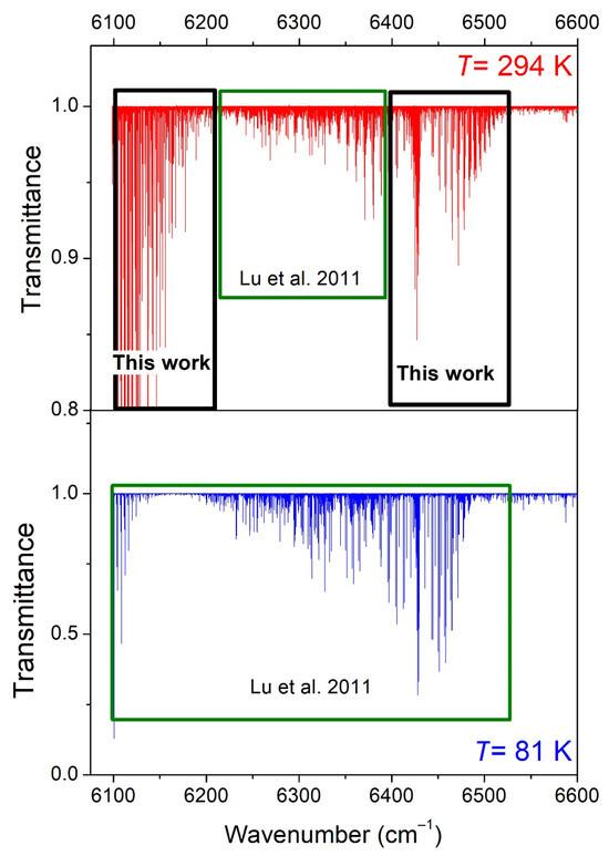 Overview comparison of the absorption spectrum of CH3D at 294 K (upper panel) and 81 K (lower panel) in the 6099–6600 cm−1 region. The sample pressures were 10.0 Torr and about 6 Torr, respectively, and the absorption pathlength was 284 cm. In the present work, the room-temperature line list was constructed in the 6099–6204 and 6394–6530 cm−1 intervals (black rectangles), while for the region in between, the empirical list was previously elaborated in Lu et al. [7].