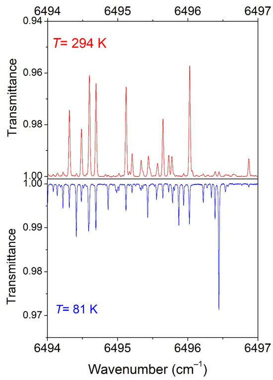 An overview of the CH3D spectra at 294 K and 81 K is displayed in Figure 2. The experimental setup for differential laser absorption spectroscopy and the spectrum acquisition procedure have been described in detail in Refs. [7,14] and will not be repeated here. Briefly, the spectral region extending between 6099 and 6991 cm−1 was covered with the help of a series of thirty-seven DFB fibered diode lasers, whose emitted light was distributed between the absorption cell, a home-made etalon, and a wavelength meter, with these last two being used for the frequency calibration of the spectra. The spectrum over an entire DFB range of about 35 cm−1 was typically recorded within 12 min by the slow tuning of its emitted frequency using a ramp between −10 °C and +60 °C for the diode temperature. One of the two weak beams reflected from the input cell window was used as a reference to correct the variations in the laser power. The 1.42 m long cryogenic cell was used in a round-trip configuration (absorption pathlength L = 284 cm) and filled with 10 Torr of high-purity CH3D (min 98 atom % D). As detailed in Lu et al., the frequency scale of each spectrum corresponding to a given DFB laser was linearized independently with the help of the etalon fringes. The absolute frequency calibration was obtained by statistical position matching with accurate CH3D line positions retrieved from an FTS spectrum of CH3D at room temperature, with the latter being itself calibrated against line positions of H2O (present as an impurity in the CH3D cell). As a result, the uncertainty of the absolute values of the centers of the well-isolated lines is estimated to be on the order of 1 × 10−3 cm−1.