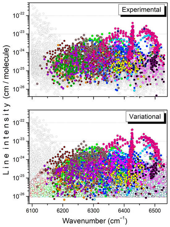Overview of the experimental and variational line lists at 294 K in the 6090–6530 cm−1 interval. Twenty bands predicted by variational calculations are plotted with colored open circles in the lower panel. For each band, the assigned transitions are highlighted with filled circles in both the experimental and variational line lists.