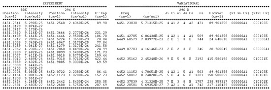 The rovibrational (RV) assignments have been added to the two experimental lists provided in Supplementary Material. A sample of the 81 K list is presented in Figure 9. We have gathered, in the two lists, the spectroscopic information provided by the 2T-method and by the RV assignments based on TheoReTS. In a few situations, a transition could be assigned at one temperature but not at the other because of the change in the spectrum appearance, which prevented the observation of one transition involved in GSCD relations (for instance, high rotational transitions are missing in the 81 K dataset). In those situations, the RV assignment was transferred from one temperature to the other. In addition, we extrapolated the intensity values from 81 K to 294 K using the Elow values and checked the consistency of the extrapolated value by a direct superposition to the spectrum at 294 K. The same test was performed by extrapolating the 294 K line list at 81 K. In the few cases of strong disagreement between the extrapolated line intensity and observation, the RV assignment was deleted. In a number of cases, the temperature dependence of the intensity was validated by all but one transition involved in GSCD relations. In those situations, the RV assignment of the problematic component was kept but tagged with “d” (doubtful).