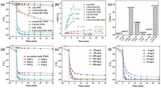 The effects of the catalyst as well as PMS and BPA concentrations on BPA degradation are depicted in Figure 4d–f. The BPA degradation efficiency and the apparent rate constants k increased with increasing catalyst contents (Figure 4d and Figure S4a). Furthermore, when the concentration of PMS increased from 50 to 200 mg/L, the removal rate of BPA initially increased and then decreased (Figure 4e). This phenomenon can be attributed to the saturation of the active sites and self-scavenging of excess radicals, thereby inhibiting the BPA degradation process at high PMS concentrations [45]. At the same time, the catalytic activity of CoO/CuO@CBC and the value of k decreased significantly with increasing BPA concentrations, as shown in Figure 4f and Figure S4c. Considering both degradation effectiveness and economic efficiency, a catalyst dosage of 0.05 g, PMS concentration of 100 mg/L, and BPA concentration of 10 mg/L were selected for further experiments.