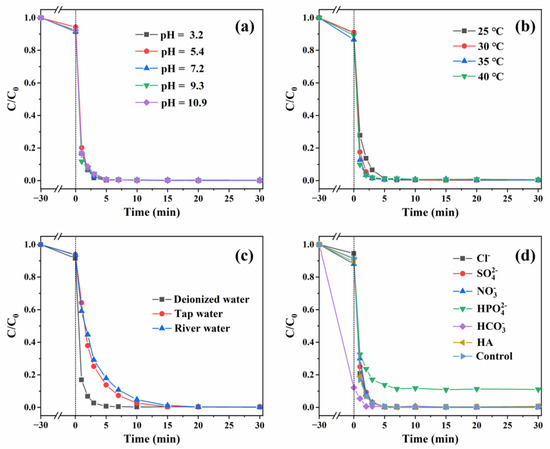 Effects of (a) initial pH, (b) temperature, (c) water matrix, and (d) inorganic anions and humic acid on BPA degradation in the CoO/CuO@CBC/PMS system. Reaction conditions: catalyst = 0.05 g, BPA = 10 mg/L, PMS = 100 mg/L, initial pH = 7.2 (unadjusted), inorganic anions = 20 mM, HA = 10 mg/L, T = 25 °C.