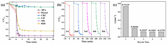 To verify the catalytic ability of the CoO/CuO@CBC catalyst, we further evaluated the universality of the CoO/CuO@CBC/PMS system on the degradation of other pollutants, such as phenol, CBZ, CIP, MB, and RhB. From Figure 6a, it can be seen that there was no significant effect on the degradation of CBZ and CIP by the CoO/CuO@CBC/PMS system. However, CoO/CuO@CBC exhibited good PMS activation to remove phenol and MB (removal efficiency: phenol 100%, MB 100%), whereas it demonstrated a satisfactory removal effect on RhB (removal efficiency 85%).