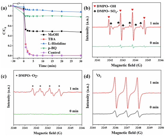The reactive oxygen species involved in the CoO/CuO@CBC/PMS system and their contribution to BPA degradation are further illustrated in Figure 7. Catalytic activity measurement of the CoO/CuO@CBC was carried out in the presence of various radical scavengers, with methanol employed to quench •SO4− and •OH, whereas TBA, L-histidine, and p-BQ were used to quench •OH, 1O2, and •O2−, respectively [62,63]. As shown in Figure 7a, the BPA removal efficiency decreased from 99.3% to 50.8%, 7.3% and 20.6% after 5 min in the presence of MeOH, L-histidine, and p-BQ, respectively. However, the addition of 25 mM TBA showed a negligible influence on BPA oxidation, indicating that •OH was not the primary active species in the CoO/CuO @CBC-mediated system. The difference between TBA and MeOH provided a preliminary verification for the existence of •SO4− free radicals, which was integrally responsible for BPA degradation in the reaction system. Furthermore, L-histidine and p-BQ showed an obvious inhibitory effect, highlighting the predominant roles of 1O2 and •O2− for BPA degradation within the CoO/CuO@CBC/PMS system.