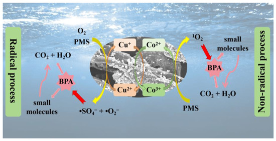 Based on the trapping experiment results, the catalytic mechanism of CoO/CuO@CBC activation of PMS for BPA degradation is proposed in Figure 8. Radical and non-radical processes for BPA degradation were also performed. First, Co(Ⅱ) on the surface of the CoO/CuO@CBC catalyst acts as the catalytic centre for the activation of PMS to produce •SO4−, coupled with Co(Ⅲ) formation via electron transfer (Equation (1)) [64,65]. Cu(II) and Co(III) directly reacted with PMS to form Cu(I) and Co(II) (Equations (2) and (3)) [66], respectively, with the newly generated Cu(II) further participating in the activation of PMS (Equations (4) and (5)) [41,67]. This maintained fast PMS activation by the cyclic transformation of Cu and Co for BPA degradation. This process led to the production of Co(II), Co(III), Cu(I), and Cu(II), as shown in the XPS spectrum of the catalyst after use (Figure S5). Subsequently, the produced •SO5− in turn generated 1O2 as shown in Equation (6) [65]. Furthermore, self-decomposition of PMS, enhanced by CoO/CuO@CBC, could contribute to 1O2 formation [64]. Previous work showed that dissolved oxygen could react with Cu(Ⅰ)/Co(Ⅱ) to form •O2− (Equations (7) and (8)) [67,68]. Because of its high specific surface area, hierarchical mesopores, and excellent conductivity, CBC can not only afford more adsorption and activation sites for PMS and BPA but also serve as channels for electron transfer during the oxidation process. Eventually, the reactive species such as •SO4−, 1O2, and •O2− generated in these processes attract BPA, forming various small molecule intermediates, which are further oxidised into CO2 and H2O (Equation (9)). In conclusion, the synergistic interaction between CBC and metals leads to the effective degradation of BPA in CoO/CuO@CBC/PMS system.