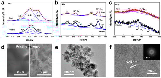 XPS data of O1s (a), Ni2p (b), and Fe2p (c) from Ni3Fe foam before and after alkaline water electrolysis aging; SEM photos of Ni3Fe foam before and after aging (d); TEM (e) and HR-TEM (f) of the active layer peeled from Ni3Fe foam after alkaline water electrolysis aging (inset, FFT pattern from HR-TEM).