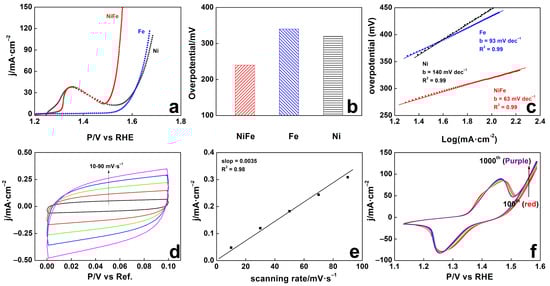 The OER performance after aging in the electrolysis cell is displayed in Figure 3a and Figures S14–S16. In Figure S14, the pristine Ni3Fe demonstrates relatively higher OER activity, while the activity on Fe foam is relatively low. After aging in the electrolysis (Figure S15), the OER performance of the Ni3Fe foam is essentially increased, and the corresponding onset potential is only around 1.47 V vs. RHE. Compared with the aged Ni and Fe foams (Figure 3a), the onset potential is reduced by nearly 150 mV. It is also noted that the OER performance of Ni and Fe foams are actually decreased after electrolysis aging (Figure S16), indicating that the aging-activation process only works on NiFe alloy foams. The elemental ratio of Ni3Fe foam is also consistent with the reported studies that Ni:Fe = 3:1 is optimal for OER process [29]. The corresponding overpotential values under the yielding current density of 100 mA·cm−2 of the aged anodes are read in Figure 3b, showing that the feedback overpotential of the aged Ni3Fe foam is only around 310 mV compared with 420 mV and 450 mV from Fe and Ni foams, respectively. The derived Tafel slopes (Figure 3c) from Figure 3a also disclose the smallest value on aged Ni3Fe foam, indicating that the rate-determining step (RDS) is M-OH + OH− → M-O + H2O + e− and/or M + OH− → M-OH + e− [15,36]. As the micro-structure shows, the wrinkled surface on the aged electrode consequently leads to an enlarged electrochemical surface area (ECSA). Therefore, the ECSAs of Ni3Fe foams before and after aging are also evaluated by measuring the cyclic voltammetries (CVs) under various scanning rates in non-Faradaic windows (Figure 3d,e and Figure S18). The electrochemical active surface area is obviously enlarged after electrolysis aging on Ni3Fe foam. Similarly, other ECSAs of the metallic and alloy foams are also enlarged after aging (Figures S17–S21). Lastly, the CVs (Figure 3f) of the Ni3Fe electrode with 1000 recycles also reflect the gradual enhancement of the OER activity.