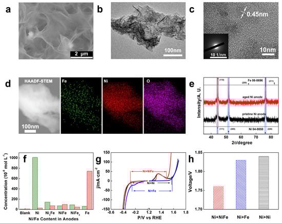 Materials preparation: All the chemicals were purchased from a supplier and directly used without further purification. The nickel foam (1 mm thickness, 110 ppm), nickel–iron alloy foam (1 mm thickness, 110 ppm), and iron plate (1 mm thickness) were customized from JSD (Suzhou, China) supplier. Before use, the metallic foams were firstly sonicated in diluted hydrochloric acid (~4 M) solution for 10 min to remove the oxides on the surface and then washed with Milli-Q water (18.2 MΩ·cm, Millipore, Burlington, MA, USA), acetone, and ethanol. The metallic foams were then cut into a certain size of 3 × 5 cm2 and utilized into an electrochemical cell filled with 1 M KOH electrolyte (Sigma, St. Louis, MO, USA, electronic degree, >99.999%). To be specific, nickel foams were used as cathodes, while the counter anodes were arranged as nickel foams, nickel–iron foams (Ni:Fe ratios = 3:1, 1:1, and 1:3), or iron foam. The five cells were then applied under a constant electrolysis current density of 300 mA·cm−2 (DC power supply, HYELEC, HY3010B, Hangzhou, China) for three months and fed Milli-Q water to maintain the electrolysis. The electrodes and electrolyte were thereafter dissembled from the electrolysis cell and collected for analysis, respectively.
