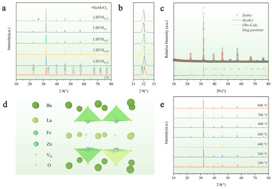 (a) XRD patterns of the cathode material LBFMx; * corresponds to peak of BaMoO4; (b) localized magnification; (c) Rietveld refinement pattern of the LBFM0.1 sample; (d) crystal structure of LBFM0.1; and (e) HT-XRD patterns of the LBFM0.1.