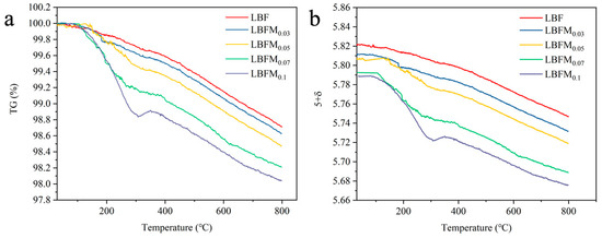 The TGA curves of the LBFMx (x = 0, 0.03, 0.05, 0.07, 0.1) series cathode powders from 30 °C to 800 °C are shown in Figure 3a. The decrease in mass between 30 °C and 300 °C is attributed to the loss of water and gas at the surface of the cathode material [21]. At temperatures higher than 300 °C, this phenomenon is mainly caused by the escape in lattice oxygen accompanied by the generation of oxygen vacancies [22], resulting in a decrease in mass, as shown in Equation (1).