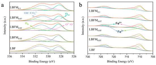 The chemical valence states of surface ions of LBFMx (x = 0, 0.03, 0.05, 0.07, 0.1) series materials were analyzed by XPS, because the cationic oxidation state is an important factor that affects the catalytic activity of the cathode. As shown in Figure 4a, the high-resolution map of O1s can fit four different characteristic peaks, indicating the existence of different types of oxygen species [24]. The diffraction peak at 528.35 eV (±0.2 eV) can be attributed to lattice oxygen (Olat). The peak at 529.3–531.12 eV (±0.2 eV) is related to the adsorbed oxygen (O2−O− and OH−/CO32−), while the peak at 532.11 eV (± 0.2 eV) belongs to Ovacancy and moisture oxygen (OH). The ratio between the adsorbed oxygen (OC) and lattice oxygen (Olat) reflects the content of surface oxygen vacancies. Therefore, the calculated OC/Olat ratio is listed in Table S3, and its ratio is relatively increased with the increase in doping amount, indicating that Mo can replace Fe at the B-site to obtain more oxygen vacancies and oxygen adsorption/dissociation active centers. In the LBF lattice, the holes generated by Fe3+/Fe4+ are electron carriers and provide Fe3+–O2−– Fe4+ electron transport paths for hole transport [25]. Therefore, the valence state of Fe in LBFMx materials needs to be studied. Figure 4b shows the high-resolution XPS map and fitting curve of Fe2p at room temperature. The binding energy is decomposed into two different peaks at 710.2 eV (±0.15 eV) and 711.2 eV (±0.26 eV), corresponding to Fe3+2p3/2 and Fe4+2p3/2, respectively. The binding energies of 722.9 eV (±0.14 eV) and 724.2 eV (±0.25 eV) correspond to Fe3+2p1/2 and Fe4+2p1/2, respectively [26,27]. The percentage values of Fe3+ and Fe4+ are listed in Table S3. With the increase in the Mo doping amount, the content of Fe4+ decreased, and the average valence state of Fe gradually decreased.