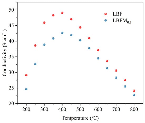 For the understanding of the effect of Mo doping on oxygen ion and hole conduction, the conductivity of LBFMx (x = 0 and 0.01) was measured from 200 °C to 800 °C in air, and the results are shown in Figure 5. At 400 °C, both samples showed an increasing trend of electrical conductivity with increasing temperature, which follows the small polaron conduction mechanism [28]. The electrical conductivity decreased with increasing temperature at 400–800 °C, because the oxygen content decreased with increasing temperature, and a large amount of lattice oxygen is released. Subsequently, the carrier concentration gradually decreased. At 400 °C, the conductivities of LBF and LBFM0.1 are 49 and 42 s·cm−1, respectively. The conductivity decreased with the increase in Mo doping concentration. This finding can be explained by the following reasons: According to the principle of charge conservation, Mo doping at the B-site causes a partial reduction of Fe4+ to Fe3+, which is confirmed by the XPS results, and this phenomenon leads to a decrease in the concentration of electron holes. Therefore, the conductivity of electrons decreased. Second, the electron conduction in peroxides follows the small-pole jump conduction mechanism and is conducted by the Bn+1-O2−-Bn−1 net structure, and the non-conductive Mo-O bond increases with the increase in Mo substitution, thus hindering the electron transport and decreasing the conductivity [19,29].