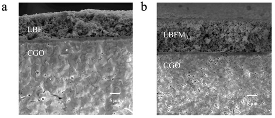 Figure 7 and Figure S3 show the SEM images of symmetric cell sections LBFMx|CGO (x = 0 and 0.1). The samples are all loose and porous, which is conducive to gas diffusion, oxygen ion transport, and charge transfer. In addition, the cathode material is well-attached to the electrolyte CGO, and no obvious cracking and delamination was observed between the electrolyte and the cathode material, confirming that it has a good chemical compatibility with the electrolyte.