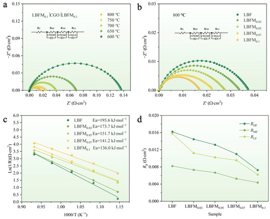 (a) Nyquist curve of LBFM0.1|CGO|LBFM0.1 in the range of 600–800 °C; (b) Nyquist curve of LBFMx|CGO|LBFMx at 800 °C; (c) Rp Arrhenius diagram of LBFMx in the range of 600–800 °C; and (d) Rp of LBFMx at 800 °C.