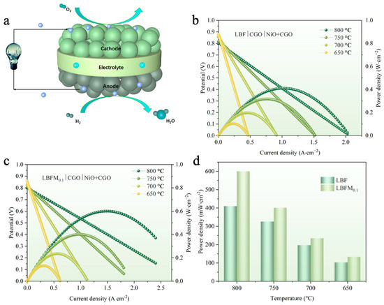 The effect of doping Mo on the output performance of a single cell was compared by preparing the anodic supported single cell with CGO as the electrolyte, and the structure is shown in Figure 9a. By using humidified hydrogen as the fuel gas and having the cathode side in direct contact with air, a single-cell LBFMx|CGO|NiO + CGO (x = 0 and 0.1) was tested. The I–V–P curves at 650–800 °C are shown in Figure 9b,c. Figure 9d shows the measured peak power density (PPD) of a single cell at different temperatures. The PPD value of LBFM0.1|CGO|NiO + CGO is 599 mW·cm−2 at 800 °C, which is about 46% higher than that of LBF at the same temperature, possibly because of the low polarization resistance of LBFM0.1, indicating that the Mo substitution of Fe at the B-site improves the electrochemical performance [19]. Figure S4 shows the SEM image of the single-cell LBFM0.1|CGO|NiO + CGO after the test. No obvious delamination was observed between the components, indicating the good chemical compatibility and thermal matching between components. The electrolyte layer after sintering at high temperature is relatively dense, ensuring a high open-circuit voltage.