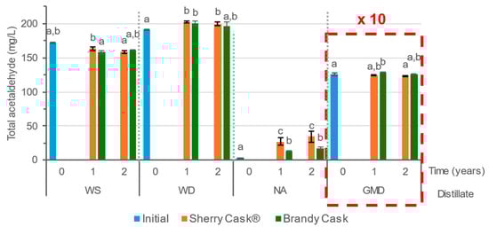 Total acetaldehyde in the initial wine spirit (WS), wine distillate (WD), neutral alcohol (NA), and grape marc distillate (GMD) and after ageing for 1 and 2 years. GMD values should be multiplied by a factor of 10. Different letters indicate that a significant difference has been obtained from the Tukey HSD test (p < 0.05).