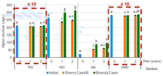 WS and GMD are the distillates with the highest levels of total higher alcohols, which, as previously noted, are distilled at lower alcoholic strength and the separation of the distillate fractions is not as exhaustive as that achieved with WD or NA (Figure 2). In this study, the total higher alcohol contents in GMD (2810 mg/L) were greater than in WS (2101 mg/L), although in some studies higher alcohol contents in GMD are below those found in some wine distillates []. The behavior during ageing does not show a clear trend. The changes are relatively small and, in some cases, without significant differences with the initial distillate. In the case of WS, we can see how total higher alcohols initially decreased during the first year in BC and then they increased to levels similar to those of the initial distillate. The same decrease in total higher alcohols was observed when WS was aged for the first year in SC, after which it remained invariable over the 2nd year. Regarding WD, an increase in total higher alcohols was observed when aged in BC. When aged in SC they decreased slightly, although no significant differences were determined after the second year of ageing with respect to their initial concentration. In the case of NA, which was the distillate with the lowest content of higher alcohols, increases were observed when aged in either cask type, being more pronounced over the first year of ageing than over the second one, and also more noticeable when aged in BC than in SC. Finally, GMD exhibited marginal changes in total higher alcohol content, with a slight increase after 2 years in BC and no significant differences when aged in SC.
