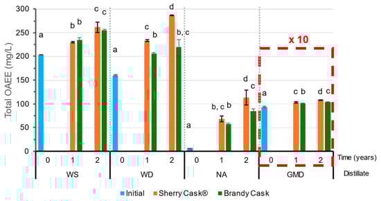 Total organic acids ethyl esters (OAEE) in the initial wine spirit (WS), wine distillate (WD), neutral alcohol (NA), and grape marc distillate (GMD) and after ageing for 1 and 2 years. GMD values should be multiplied by a factor of 10. Different letters indicate that a significant difference has been obtained from the Tukey HSD test (p < 0.05).