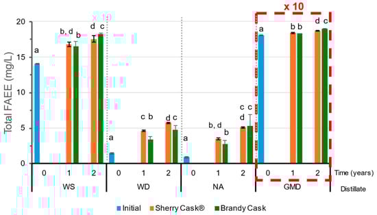 Total initial fatty acid ethyl esters (FAEE) in wine spirit (WS), wine distillate (WD), neutral alcohol (NA), and grape marc distillate (GMD) after ageing for 1 and 2 years. GMD values should be multiplied by a factor of 10. Different letters indicate that a significant difference has been obtained from the Tukey HSD test (p < 0.05).