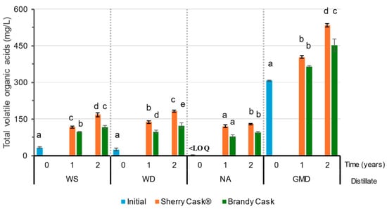 Total initial volatile organic acids in wine spirit (WS), wine distillate (WD), neutral alcohol (NA), and grape marc distillate (GMD) after ageing for 1 and 2 years. A different letter indicates significant differences in a particular row between the values obtained from the Tukey HSD test (p < 0.05). LOQ: Limit of quantification.