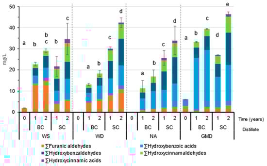 The total concentration of other esters, such as organic acid ethyl esters (OAEE) (ethyl acetate + ethyl lactate + diethyl malate + diethyl succinate + diethyl tartrate) in the samples studied can be seen in Figure 3, and in greater detail in Table S2. The total OAEE content in GMD was the highest of all the distillates, registered at 930 mg/L in its initial state and reaching 1090 mg/L in the samples aged in SC for 2 years. The second distillate with the highest amount was WS followed by WD. Although WS presented a greater initial concentration, WD exhibited a greater increase during its ageing, mainly due to a more pronounced increment of its ethyl acetate content. NA, in turn, presented the lowest values, with an initial 6.5 mg/L OAEE content mainly attributable to ethyl acetate. This value increased during ageing and reached 84 mg/L and 114 mg/L after two years of ageing in BC and SC, respectively.