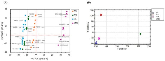 Factors 1 (49.5%) and 2 (30.4%) are represented in Figure 7A, and the coefficients of the factors with r > |0.4| are shown in Table 2. Factor 1 differentiates the samples by distillates, and four groups are identified: GMD, WS, WD, and NA. Factor 2 differentiates the time and conditions of the ageing process. The groups are ordered based on the initial distillate, moving through those aged 1 year in BC, then 2 years in BC, and the furthest away aged in SC.