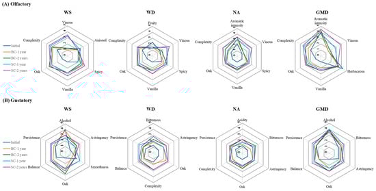 Spider chart comparison of the (A) olfactory and (B) gustatory profiles of wine spirit (WS), wine distillate (WD), neutral alcohol (NA), and grape marc distillate (GMD) before and after ageing in brandy cask or sherry cask for 1 and 2 years.