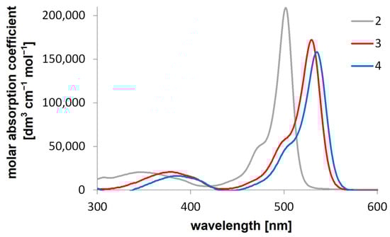 Absorption properties of synthesized dimers 2–4 were determined by recording UV-Vis spectra in dichloromethane (DCM), methanol, ethanol, acetonitrile, N,N-dimethylformamide (DMF), and dimethyl sulfoxide (DMSO). The spectra of DCM are presented in Figure 2, and other solvents are shown in the Supplementary Information. These particular data, including absorption maxima (λAbs) with logarithms of molar absorption coefficients (log ε) in DCM, are shown in the Supplementary Information (Table S4). It was found that the dimeric structure of compounds 2–4 did not significantly influence the positions of the absorption maxima, as they were very similar to those of monomeric BODIPY analogs containing meso-phenyl substituents [29,41,42]. A similar situation was observed in other non-orthogonal meso-meso dimeric BODIPYs [26,43]. The maximum absorption of compound 2 in the tested solvents was found between 498 and 502 nm, while in the range of 524–529 nm for brominated analog 3, and from 530 to 536 nm in the case of iodinated dimer 4 (Table S4 in the Supplementary Information). The bathochromic shift in the absorption bands observed for halogenated dimers 3 and 4 results from the electron-accepting abilities of bromine and iodine atoms [29]. It is worth noting that BODIPY 2–4 revealed very high absorption intensity, as the values of molar coefficient (ε) for their absorption maxima were in the range of 5.05–5.33 (Table S4 in the Supplementary Information).