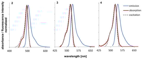 The emission properties of dimers 2–4 were determined in acetonitrile. The observed long-wavelength absorption, emission, and excitation bands are presented in Figure 3, whereas obtained data, including the wavelengths of emission maxima (λem), Stokes shifts (Δλ), and fluorescence quantum yields (ΦF), are shown in Table 1.