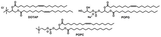 The relatively large size and high lipophilicity of the obtained BODIPY dimers result in insolubility in a water environment, including culture media, which hinders the examination of their biological properties. For this reason, dimers 2–4 were incorporated into liposomes, which are known to be promising delivery systems for photosensitizers [31,54,55]. Two different liposomal formulations were prepared by a thin-film hydration method: (i) positively charged liposomes composed of 1,2-dioleoyl-3-trimethylammoniumpropane (DOTAP, chloride salt) and 1-palmitoyl-2-oleoyl-sn-glycero-3-phosphocholine (POPC); and (ii) negatively charged based on 1-palmitoyl-2-oleoyl-sn-glycero-3-phospho-(1′-rac-glycerol) (sodium salt, POPG) and POPC, were prepared by a thin-film hydration method [56,57,58,59] (Figure 4).