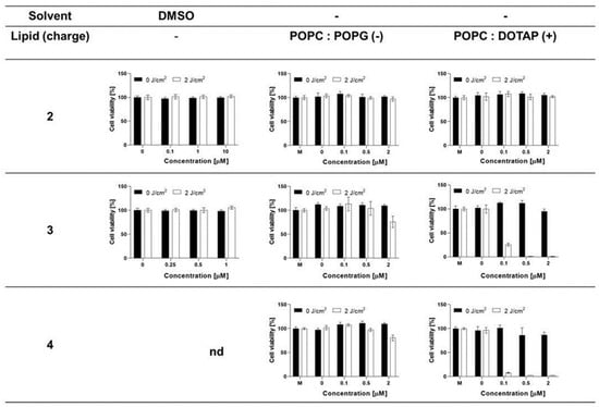 The activity of dimers 2–4 in free form (dissolved in DMSO and cell culture medium) and in positively and negatively charged liposomes towards MDA-MB-231 cells. The cells were treated with BODIPYs for 24 h and irradiated with a light dose of 2 J/cm2 or not irradiated in the case of the dark control. The MTT assay was performed 24 h post-irradiation. The data presented results from preliminary experiments. Abbreviations: M—cell culture medium, nd—not determined.