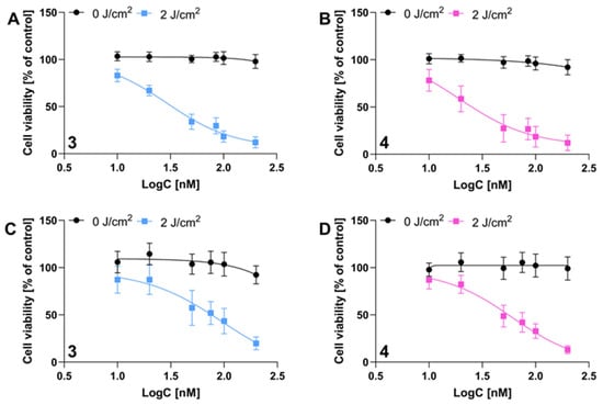 Interestingly, as presented in Figure 5, only positive charged liposomal formulations for BODIPYs 3 and 4 were active. The cationic liposomes can pass the cell membrane via an endocytic pathway and membrane fusion. It was reported that membrane fusion could deliver the encapsulated compound directly to the cytoplasm and overcome endosomal/lysosomal degradation. Thus, the cationic liposomes may not only improve the cargo transport by a cellular membrane but also, if the membrane fusion pathway is involved in this process, the loaded compound can be protected from endosomal and metabolic degradations, which can finally increase efficacy [74]. Several studies showed that DOTAP, as a cationic lipid in the liposomal formulation, could enhance fusogenicity [75,76,77]. On the other hand, negatively charged liposomes were found to be less stable than positively charged liposomes and more easily degraded by the reticuloendothelial system [71]. The presented characteristics of positively and negatively charged liposomes could have contributed to our results, showing biological activity only for the positively charged liposomes. In the liposomal formulations, we tested three compounds, but only two proved to be active, which may be related to the well-known heavy atom effect in BODIPY molecules [78]. BODIPY 3 and 4 are brominated and iodinated dimers, respectively, with a significantly higher singlet oxygen generation than BODIPY 2 without heavy atoms. Since singlet oxygen is one of the main ROS generated during PDT, the higher generation of singlet oxygen by BODIPYs 3 and 4 likely translates into a more substantial effect. Furthermore, these results are consistent with the data obtained for compound 2 in microbiological studies, where no photodynamic activity was observed either. Further experiments were performed for the positively charged liposomal formulation of 3 and 4 towards MDA-MB-231 and A2780 cells to determine the IC50 values. The dose–response curves are presented in Figure 6.