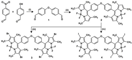 The precursor of novel BODIPY dimers, 4,4′-oxydibenzaldehyde (4-(4-formylphenoxy)benzaldehyde, compound 1), was synthesized using palladium on carbon (Pd/C) catalyzed cross-coupling reaction of 4-nitrobenzaldehyde and 4-hydroxybenzaldehyde according to Begum et al. procedure [38]. The subsequent reaction of obtained dialdehyde 1 with 2,4-dimethylpyrrole utilizing Galeotti et al. conditions [39] (three-step reaction in dichloromethane using trifluoroacetic acid, 2,3-dichloro-5,6-dicyano-1,4-benzoquinone (DDQ), N,N-diisopropylethylamine (DIPEA) and boron trifluoride diethyl etherate (BF3*O(C2H5)2)) led to novel BODIPY dimer 2 (Scheme 1). Noteworthy, 4,4′-oxydibenzaldehyde was previously used in Hantzsch and Biginelli reactions as a precursor of dihydropyridine dimers with promising antibacterial activity [40]. Next, BODIPY dimer 2 was reacted with N-bromosuccinimide (NBS) in dichloromethane generating the analog containing four bromine atoms (compound 3). Similarly, iodinated derivative 4 was obtained in the reaction with iodine and iodic acid solution in ethanol (Scheme 1).