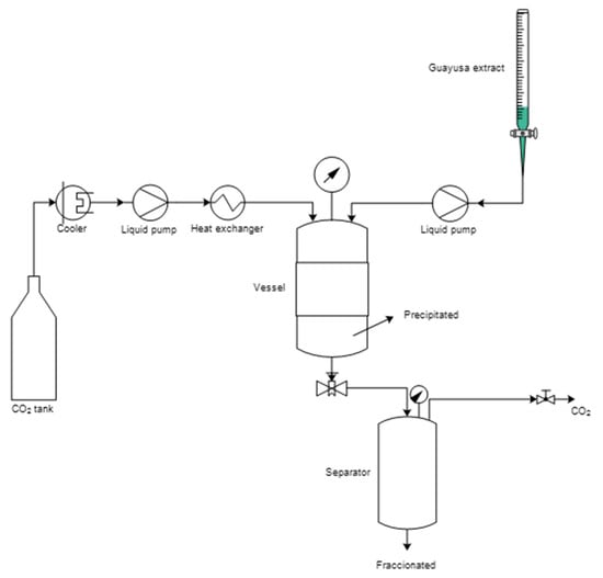 The SAE technique was applied to the total ethanolic extract; for this purpose, a homemade supercritical pilot plant was used []. The equipment consisted of a precipitation vessel, in which the contact of the continuous flow of ethanolic extract and CO2 at supercritical conditions (SC-CO2) occurred. Figure 3 shows a schematic representation of the pilot plant. The antisolvent capacity of the SC-CO2 was modulated by varying the pressure and temperature from 8 MPa to 12 MPa and 35 °C to 45 °C, respectively.