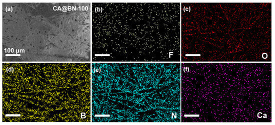 (a) Top-view SEM images for CA@BN-100 separators. EDS elemental mapping of (b) F, (c) O, (d) B, (e) N, and (f) Ca.