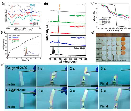 (a) FTIR for CA@BN-50, CA@BN-100, CA@BN-200, and CA separators. (b) X-ray diffraction pattern of Celgard 2400, CA@BN-50, CA@BN-100, CA@BN-200, and CA separators. (c) Stress-strain curve of Celgard 2400, CA@BN-50, CA@BN-100, CA@BN-200, and CA separators. (d) TG curves of CA, CA@BN-50, CA@BN-100, CA@BN-200, and Celgard 2400 separators. (e) Digital photographs of CA, CA@BN-50, CA@BN-100, CA@BN-200, and Celgard 2400 separators after heating at different temperatures. (f) Digital photographs of the ignition test of Celgard 2400 and CA@BN-100 separators.