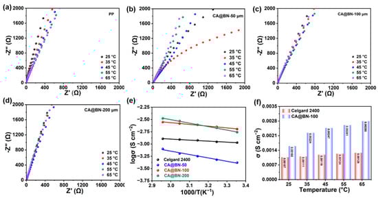 Ionic migration number and ionic conductivity are crucial metrics for assessing the separator’s ability to move ions [36]. We fabricated SS||SS cells and performed impedance tests, and the results were shown in the Nyquist curves in Figure 3a–d. The bulk resistance of the Celgard 2400, CA@BN-50, CA@BN-100, and CA@BN-200 showed a steady decrease as the temperature rose from 25 °C to 65 °C.