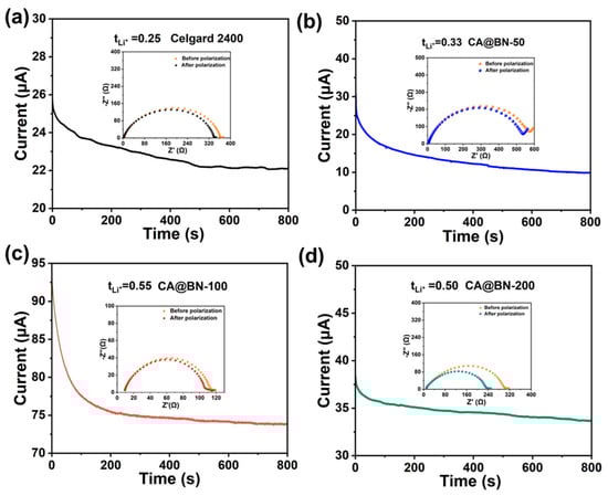 Chronoamperometry of (a) Li| Celgard 2400|Li, (b) Li|CA@BN-50|Li, (c) Li|CA@BN-100|Li, (d) Li|CA@BN-200|Li cells under a voltage of 10 mV (inset is the corresponding EIS profiles for the same cell before and after polarization).