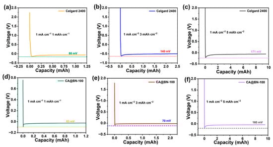 Using CA@BN-100 and Celgard 2400 separators, we assembled Cu|separator|Li half-cells and investigated lithium nucleation on copper at current densities of 1 mA cm−2 with area capacities of 1, 3, and 5 mAh cm−2, as shown in Figure 5. The difference between the lowest instantaneous potential and the stable cycle potential, representing the level of metallic lithium deposition on the copper foil, is known as the nucleation overpotential value [42]. One of the main causes of the creation of lithium dendrites is a kinetically unfavorable process on the copper foil caused by a greater overpotential difference, resulting in a larger nucleation barrier for metallic lithium [19]. A reduced overpotential suggests that the copper foil has a uniform layer of lithium metal deposited, which is good for the battery’s cycle stability. The voltage curve of the Cu|separator|Li half-cells in Figure 5 exhibited a steep decline associated with the metallic lithium nucleation process. Then, the voltage progressively increased and stabilized, depending on the electrochemical polarization, ion-solvent dissociation, and stable cycle potential of mass transfer. The Cu|Celgard 2400|Li battery’s nucleation overpotential values under the same current density and varied area capacities were 100 mV, 140 mV, and 171 mV, respectively, as seen in Figure 5a–c. The Cu|CA@BN-100|Li battery had a similar voltage difference of 40 mV, 70 mV, and 160 mV under the same conditions (Figure 5d,e), which was significantly less than the Cu|Celgard 2400|Li batteries. It suggested the improved separator supports the battery’s lithium anode interface stability.