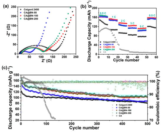 We put up a complete battery utilizing a Li anode and an LFP cathode in order to investigate the CA@BN-100 separator’s potential in real applications. Initially, we assessed the electrolyte’s compatibility with the separator using the EIS curve test [43]. The entire batteries with changed separators (CA@BN-50, CA@BN-100, and CA@BN-200) were depicted in Figure 6a. These batteries had lower interface impedances and semicircle diameters, with specific resistance values of 40 Ω, 100 Ω, and 94 Ω, respectively. These values are mostly related to the coating thickness. By comparison, the battery that was constructed using the Celgard 2400 separator had an interface resistance of 148 Ω. This outcome was explained by the improved separator’s superior electrolyte wettability, which enhanced the electrolyte and separator interface compatibility.