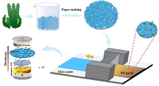 Numerous studies have shown that surface coating methods can enhance the thermal and electrochemical stability of polyolefin separators effectively [7,8,9,10]. For example, Tan et al. [11] improved polyethylene separators’ thermal stability and lithiumphilicity by coating silicon oxide particles on their surface. Liu et al. [12] increased the cycling stability of the separators by coating hexagonal boron nitride on polypropylene. Sheng et al. [13] combined hexagonal boron nitride with polyimide to coat commercial polypropylene separators, which inhibited the growth of lithium dendrites and improved thermal stability. However, because of the limitation of polyolefin matrix materials, the above-mentioned compliant separators did not change the problem of the non-degradability of conventional separators. In recent years, biomass separators based on biopolysaccharide fibers (cellulose fibers and alginate fibers) have received widespread attention due to their multilayered porous structure and the large number of polar groups in the molecular chain, which exhibit excellent electrolyte wettability, flame retardancy, and thermal dimensional stability [14,15,16].