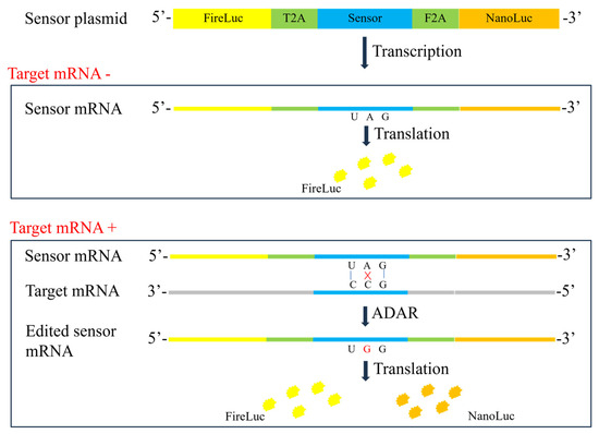 RNA editing-based reporter assay for detecting target mRNA. FireLuc, firefly luciferase; NanoLuc, nano-luciferase; T2A, Thosea asigna virus 2A; F2A, foot-and-mouth disease virus 2A.