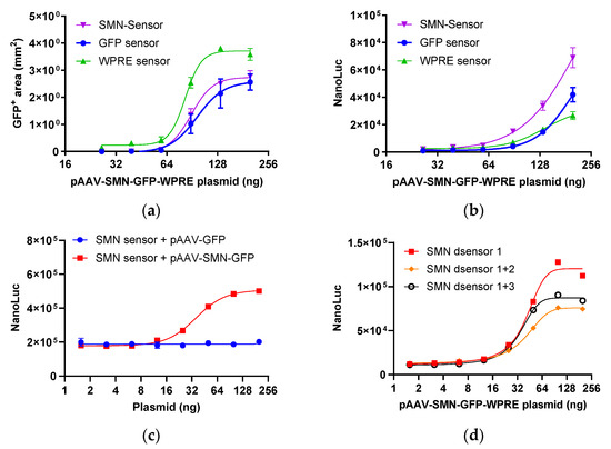 Response of sensors targeting different regions. (a) GFP expression of 293T cells cotransfected with sensor reporters and pAAV-SMN-GFP-WPRE. (b) Response of the GFP sensor, WPRE sensor, and SMN sensor to pAAV-SMN-GFP-WPRE. (c) Response of the SMN sensor to pAAV-GFP and pAAV-SMN-GFP-WPRE. (d) Response of the SMN sensor with double termination codons to pAAV-SMN-GFP-WPRE. Each plot represents two replicates. NanoLuc, nano-luciferase.