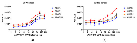 It has been reported that ADAR protein overexpression can promote A-to-G editing efficiency [15]. Three different ADAR proteins, viz. ADAR1, ADAR2, and a hyperactive mutant ADAR2 (E488Q), were introduced into stably transfected sensor cells to assess whether they can improve the sensor response. As shown in Figure 3a,b, both GFP and WPRE sensors exhibited a dose-dependent response pattern with the pAAV-GFP-WPRE plasmid. Although ADAR protein overexpression resulted in increased A-to-G RNA editing, background nano-luciferase activity also increased, resulting in an overall unchanged signal-to-noise ratio (SNR). These data suggest that ADAR protein overexpression is not necessary for optimal reporter assay results.